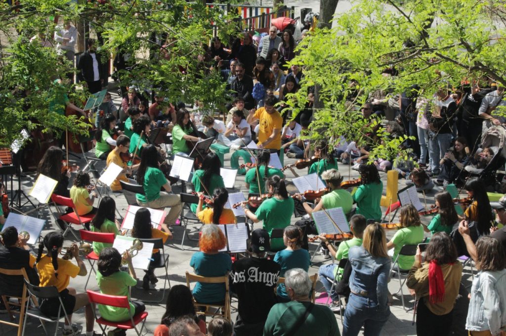 A partir de las 10:00 de la mañana, nuestra sede comenzó a recibir gente que preparaba la jornada, trayendo comida y desplazando sillas e instrumentos hacia la plaza. En el centro de este espacio ajardinado se instaló la orquesta de niños, niñas y adolescentes que durante toda la mañana llenó el barrio de melodía.